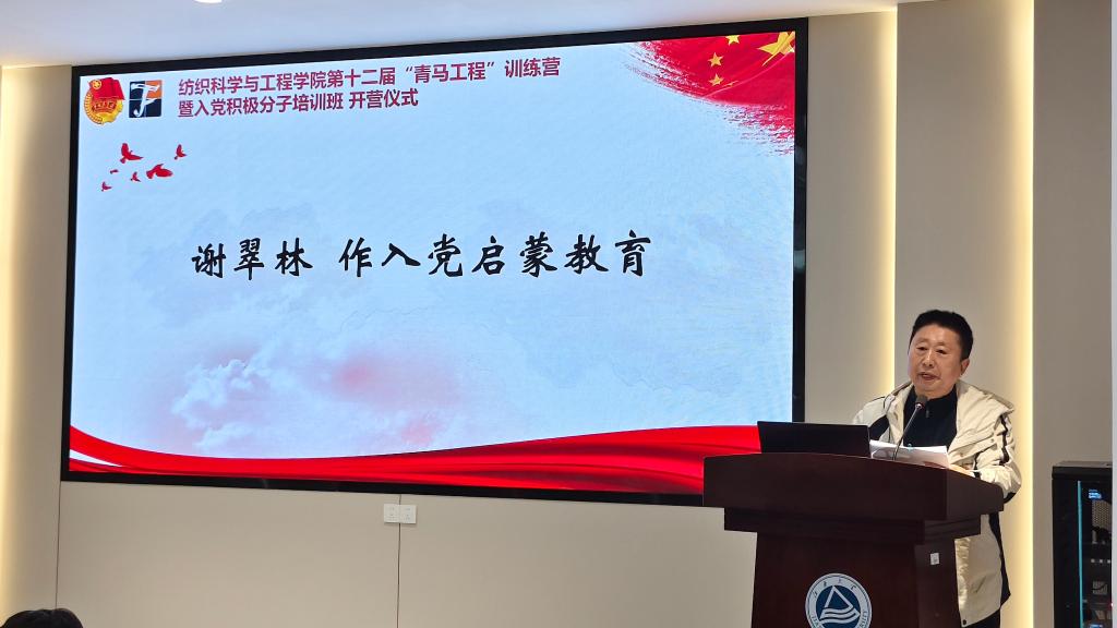 谢翠林作入党启蒙教育,他以老党员、老纺织人、老学长身份,结合自身经历分享“信仰的力量”与“纺织的情怀”。他阐述了入党的必要性,同时对学员提出三点希望:把政治标准放在首位、发扬纺织精神、传承红色基因。最后寄语学员:“组织上入党一生一次,思想上入党一生一世”。