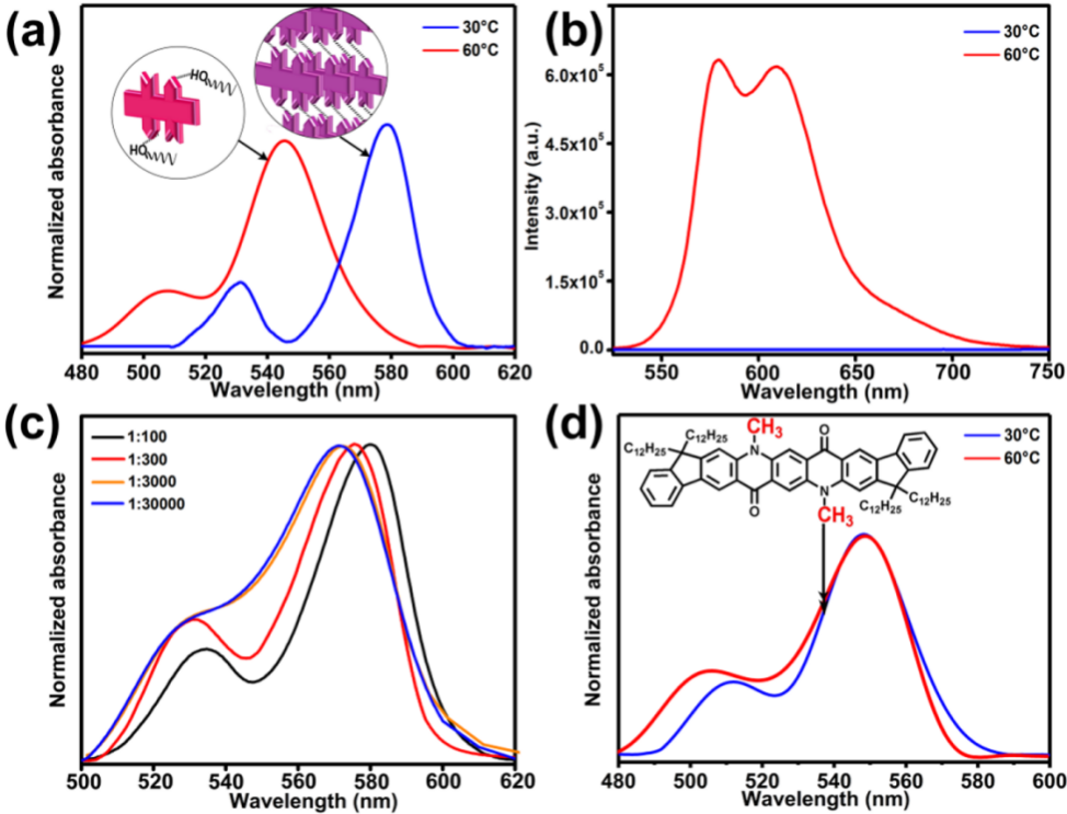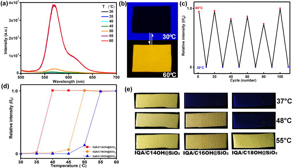 该材料是一种复合染料纳米颗粒,通过正硅酸四乙酯缩水聚合的方式包裹一种自制的双吲哚并喹吖二酮(IQA)有机染料分子和脂肪醇获得。研究发现,该材料的变色机理源自于IQA分子在脂肪醇溶剂中可调节的解离/聚集机制。而IQA分子的解离与聚集状态直接取决于溶剂的熔融和凝固。因此,通过改变溶剂组分,可以实现其变色温度的调控。此外,该材料可以通过常规的染整方法实现其在纺织品上的应用。