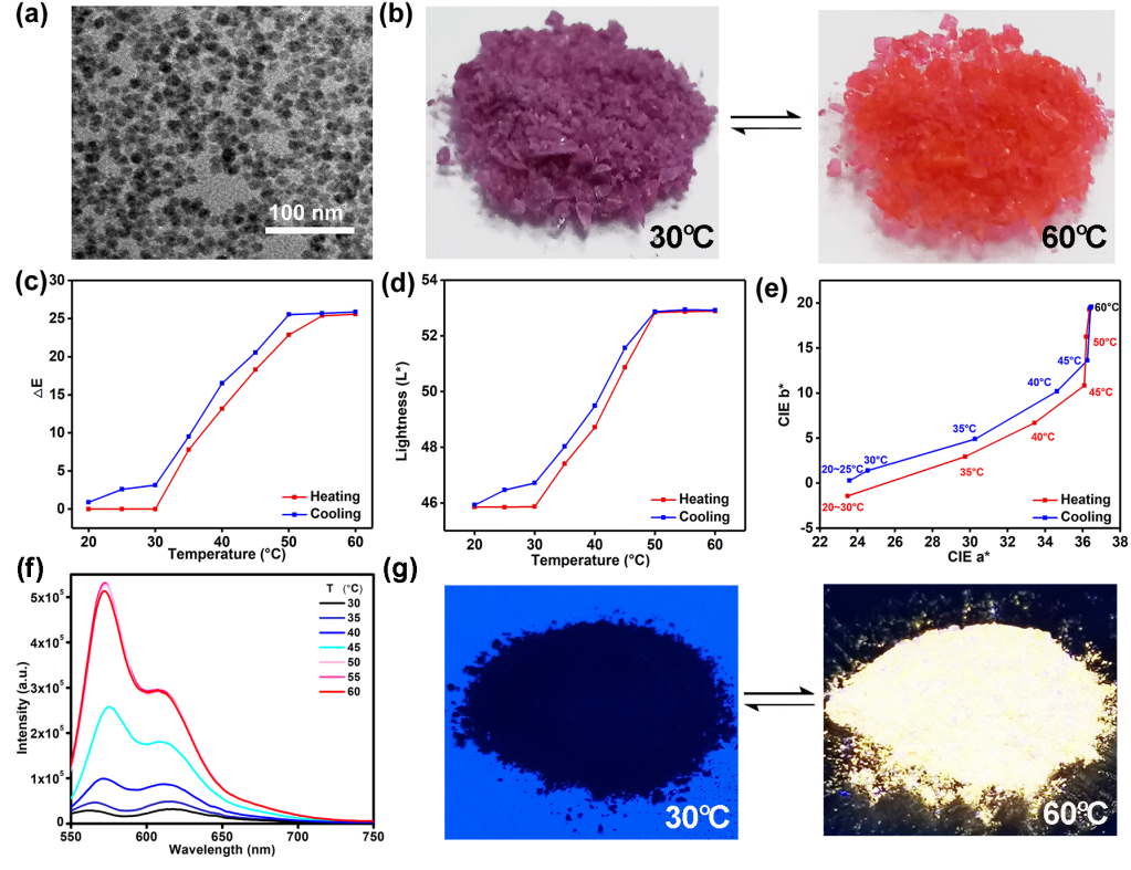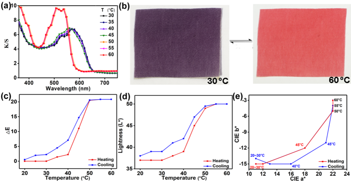 进一步研究表明,上染后的涤纶织物保留了双功能热响应材料原有的性能。随外部环境温度的变化,热响应材料和染色后的织物均以实时、高度可逆的方式呈现出清晰的颜色变化和罕见的高对比度的荧光状态变化(可见光下,由深紫色变为橘红色;紫外光(365 nm)下,由暗淡的无荧光状态突变为发射强烈的金黄色荧光)。该工作为开发更多可逆热致变色和热致荧光材料奠定了基础,同时为设计具有新颖性质的热响应材料提供了新思路。