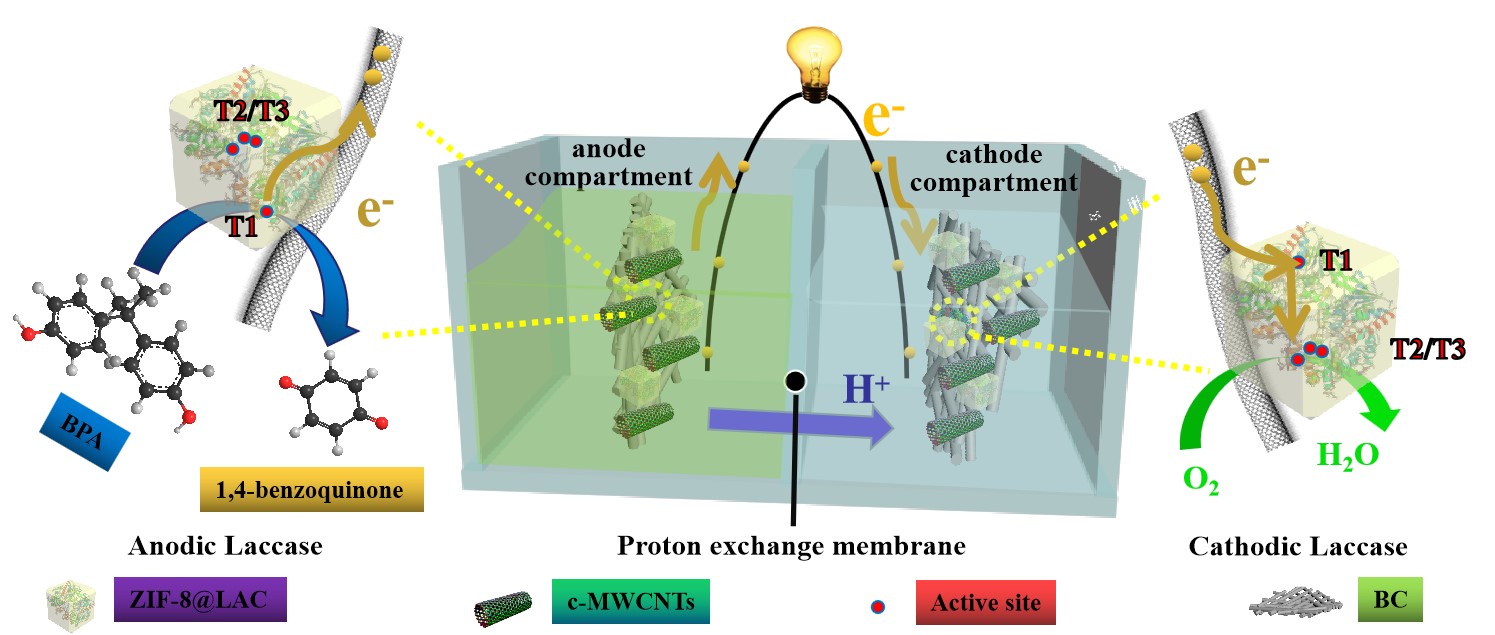 纺织科学与工程学院魏取福教授团队采用新型多孔有机金属框架材料作为酶分子固定化载体,得到了具有优异稳定性的固定化酶,并将其用于制备一种可同时作为酶生物燃料电池阴极和阳极的纤维素基高柔性电极,最终基于分子内电子转移的新概念(Chem. Eng. J., 379 (2020) 122316)构建单酶生物燃料电池基自供能传感器,实现了对酚类污染物的自供能检测。该项工作近日以题为“Encapsulation of Enzyme by Metal-Organic Framework for Single-Enzymatic Biofuel Cell-Based Self-Powered Biosensor”的研究论文被发表在Nano Energy杂志(Nano Energy68 (2020) 104308)