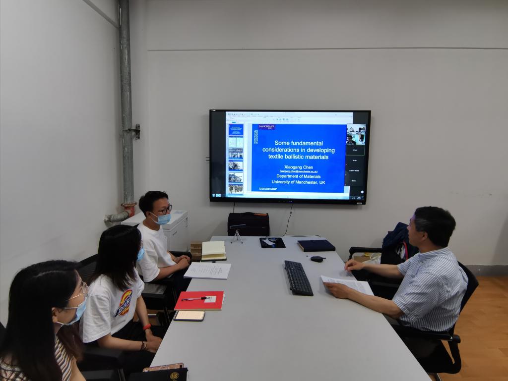在本次讲座中,陈晓钢教授首先介绍了自己和曼彻斯特大学的有关情况,然后以军用防弹衣为切入点,介绍了防弹抗冲击纺织材料的基本要求以及自己团队目前做的一些相关研究,重点论述了纱线间摩擦力、材料连续性原则、准各向同性等理论体系的完善和强化,从纤维石墨烯改性、纱线表面处理、织物结构、杂化设计、准各向同性设计、剪切增稠液的使用等领域论述防弹抗冲击研究开发的基本问题。最后,陈晓钢教授与参会师生进行了学术交流和探讨。