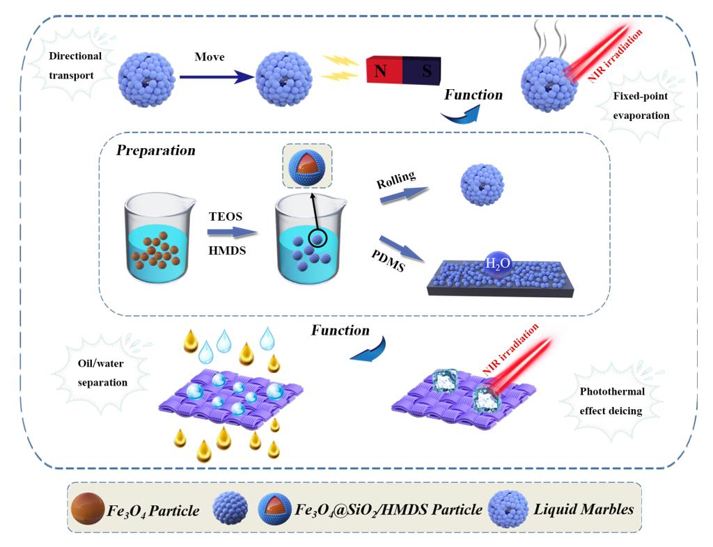 我校纺织科学与工程学院付少海教授团队在国际期刊ACS Applied Materials & Interfaces上发表了题目为“One-Pot Preparation of Fluorine-Free Magnetic Superhydrophobic Particles for Controllable Liquid Marbles and Robust Multifunctional Coatings”的学术论文(ACS Applied Materials & Interfaces,2020,12,17004-17017, IF 8.456)。该成果报道了一种无氟磁性超疏水颗粒的合成方法及其在纺织品中的应用研究。通过正硅酸四乙酯和六甲基二硅胺烷同步水解缩合,实现对四氧化三铁纳米颗粒的包覆改性,进而通过一锅法制备了稳定的磁性超疏水纳米颗粒,该颗粒可通过滚滴法包覆不同液滴,进而形成液体弹珠,实现可控液体储存、磁控液滴定向输运和液滴定点加速蒸发。通过将无机颗粒和有机硅烷的复合并对纺织品后整理,制备了具有优异爽滑透气防水多功能的纺织品材料。基于涂层光热转换性能,纺织品表现出较好的防覆冰和光热除冰/除霜等应用。同时,超疏水纺织品可以通过吸附/过滤分离实现污水的净化提纯和有机溶剂的高效回收。该论文第一作者是我校纺织科学与工程学院2019级博士生朱若斐,通信作者为付少海教授和刘明明副研究员。该研究得到了中央高校基本科研业务费专项资金资助项目(JUSRP11916,JUSRP51907A和JUSRP21933)的支持。