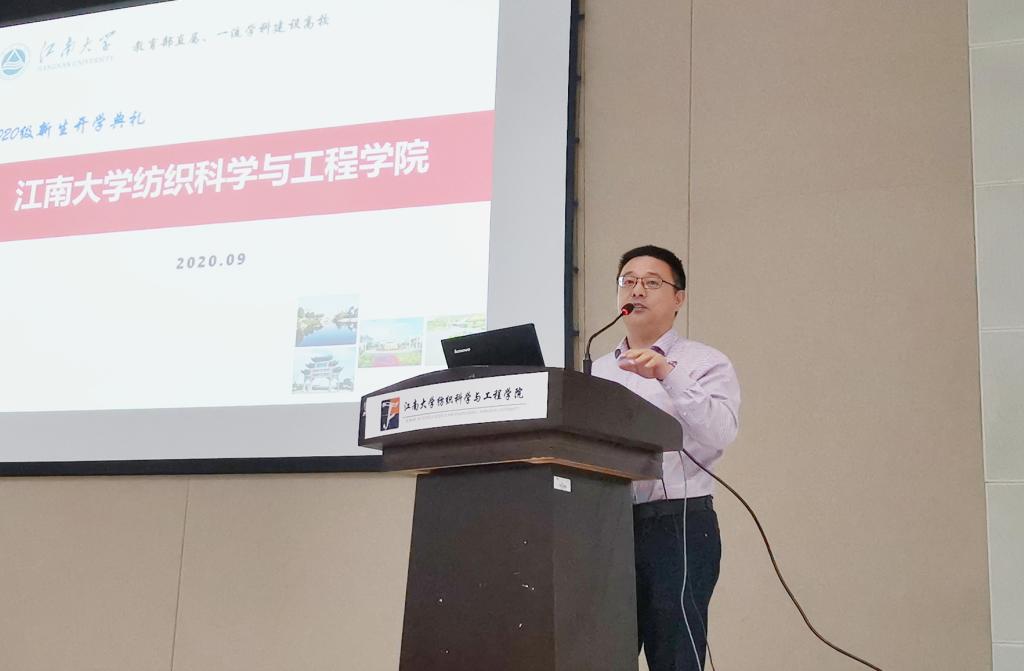付少海作学院介绍,付院长首先从纺织行业的地位、纺织创新发展动态、纺织产业创新驱动发展三方面入手,向同学们系统地讲述了什么是当代的纺织,现代纺织行业的研究重点及方向。随后他介绍了江南大学及纺织科学与工程学院的历史沿革和发展方向,并着重介绍了纺织和轻化两个专业的建设情况、师资队伍、学科优势及特色、各科研团队的科研成果及获奖。在人才培养方面,付少海还着重介绍了全员参与的卓越工程师的培养计划、全员覆盖的大学生创新活动及江南大学-北卡罗莱纳州立大学3+X本硕培养项目。此外,他还就学院升学深造率、就业质量、第二课堂成果、杰出校友、奖助学金体系及纺织教育发展基金会等方面做了详细介绍。最后,他也告诫2020级本科新生,要确立自己的人生定位,做好大学发展规划;要养成良好的生活习惯,保持健康的体魄和心理;要不断拓宽学术视野,学会思考问题,提高文化修养。
