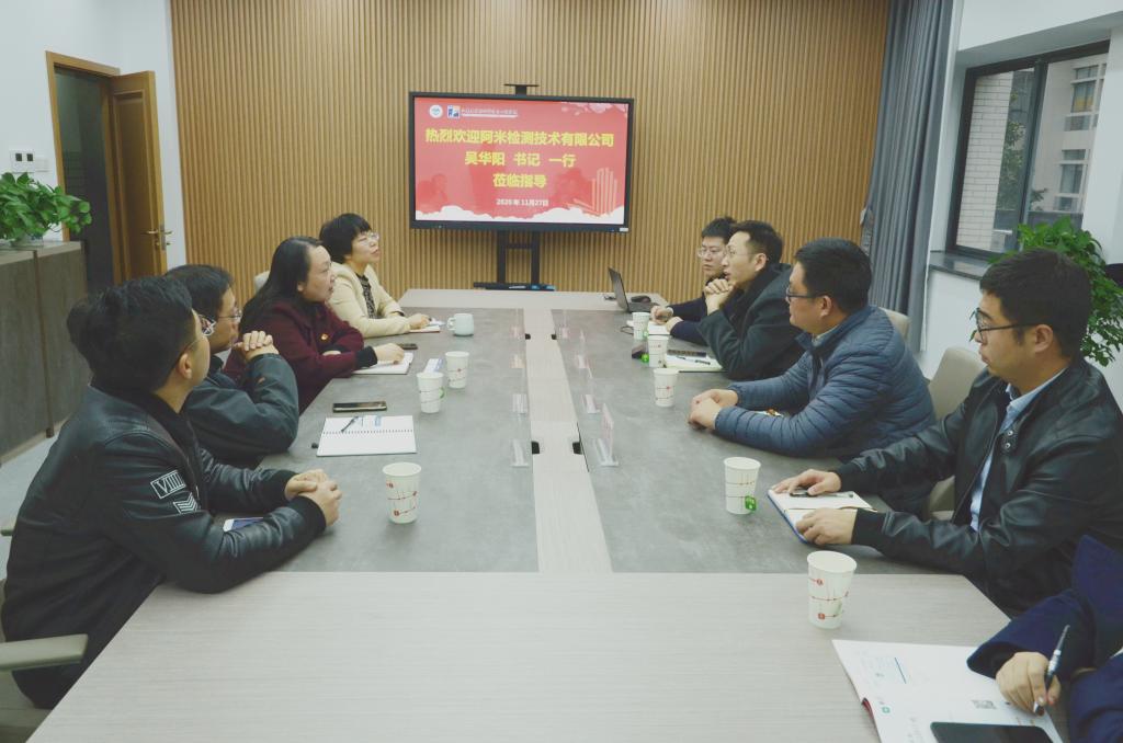 吴华阳感谢学院的热情接待,他首先介绍了阿米检测技术有限公司的发展情况:公司隶属于北京航天计量测试技术研究所,主营业务为转化航天高端技术,服务高端产业,面向全球提供计量检测、节能环保、智能装备等服务。吴华阳书记表示江南大学纺织科学与工程学院产学研优势明显,成果转化工作在国内高校名列前茅,今后将进一步与江南大学保持密切联系,依托学院的人才和学科优势,建立合作机制,在行业规范共同开展深度研究。随后吴华阳书记还就校企科研合作方向上的相关技术需求问题与学院智能纺织新材料研究室邱华教授进行技术沟通,双方一致表达了希望加强合作的愿望。