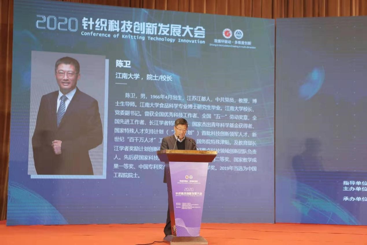 2020针织科技创新发展大会于12月4日在江苏无锡召开,本次发展大会的主题为“双循环驱动•多维度创新”,中国工程院院士、江南大学校长陈卫,中国工程院院士孙晋良、蒋士成,中国纺织工程学会理事长伏广伟,江南大学教授、针织技术创始人之一宗平生,中国针织工业协会专家委员会名誉主任王智,中国针织工业协会总工程师林光兴,中国纺织信息中心科技信息部技术经理韩俊霞,江苏省纺织工程学会秘书长王志杰,无锡市科学技术协会学会部部长刘邦盛,江南大学纺织科学与工程学院党委书记张菁,武汉纺织大学牛仔研究中心主任易长海,中国纺织工程学会针织专业委员会副主任韩光亭、张佩华、秦志刚、孟家光、文珊等行业协会领导,从事针织技术研究的高校和科研机构的领导专家以及产业集群地、国内外知名针织设备制造企业、原料生产企业、制造企业、染整企业和针织服装企业的代表共计近400人参会。大会从技术与学术层面对针织科技创新进行兼具深度和广度的交流;对行业共性问题与发展趋势进行探讨。大会由中国纺织工程学会针织专业委员会主任、江南大学针织技术教育部工程研究中心主任蒋高明教授主持。