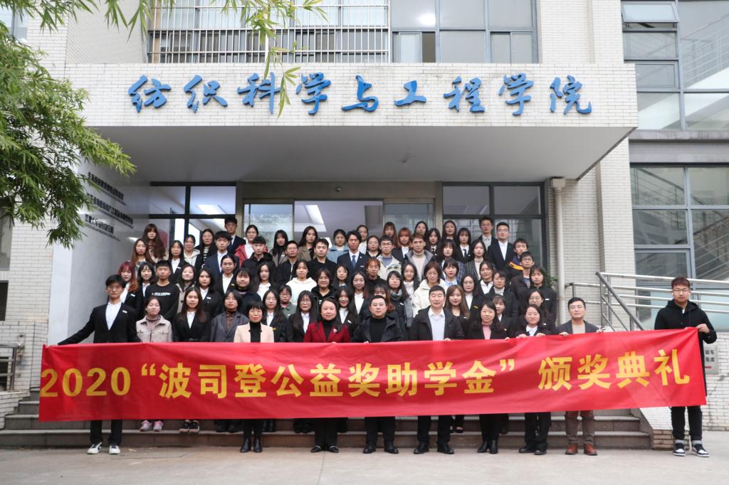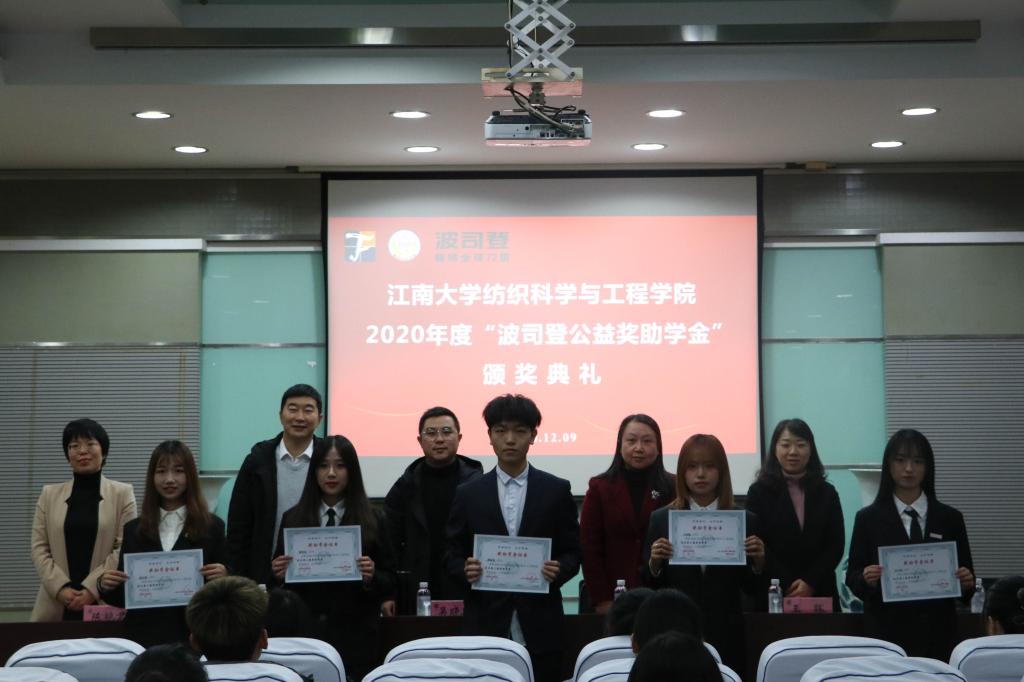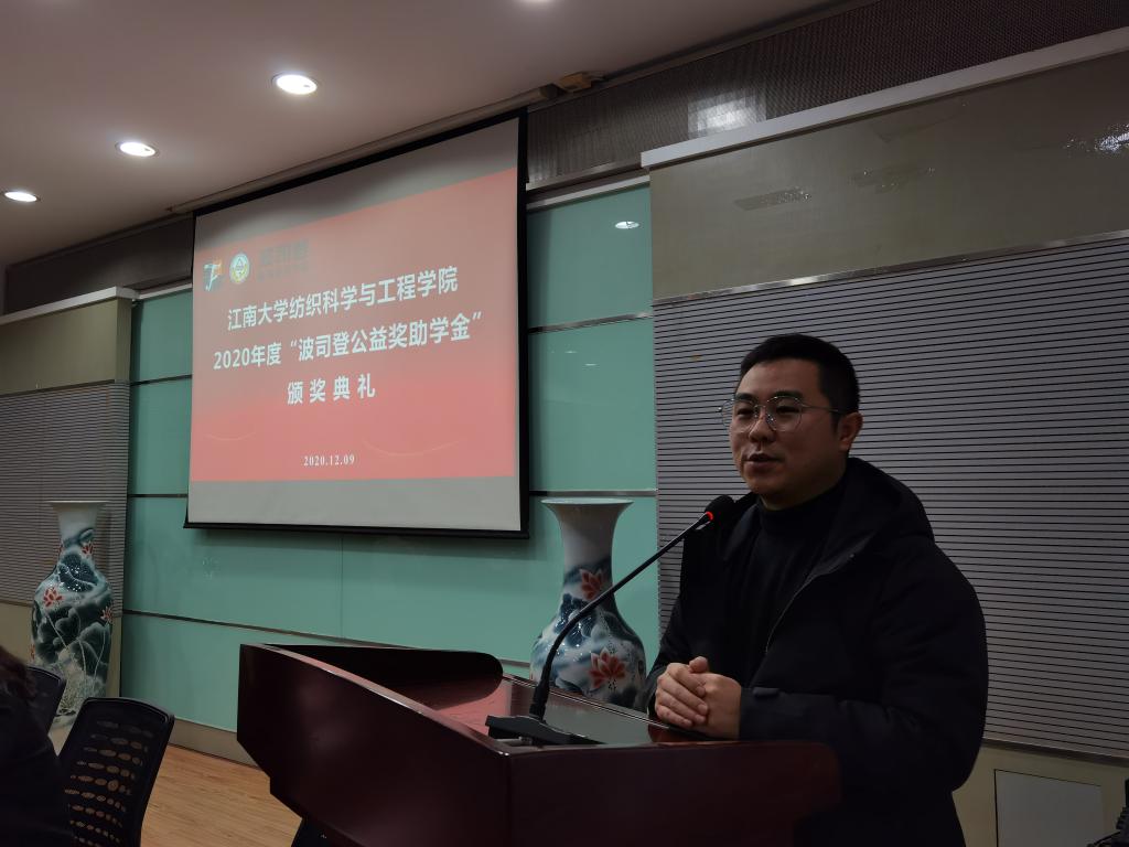 12月9日下午,纺织科学与工程学院在学院A103报告厅举行2020年度“波司登公益奖助学金”颁奖典礼,波司登集团人力资源总监吴晓明,波司登集团商学院执行院长夏志强,纺织科学与工程学院党委书记张菁、党委副书记兼副院长陈艳君,设计学院党委副书记兼副院长王晖出席颁奖典礼。2020年度“波司登公益奖助学金”获奖学生,纺织科学与工程学院2019级家庭经济困难学生参加颁奖活动,典礼由纺织科学与工程学院社会资源条线负责辅导员陈裕主持。