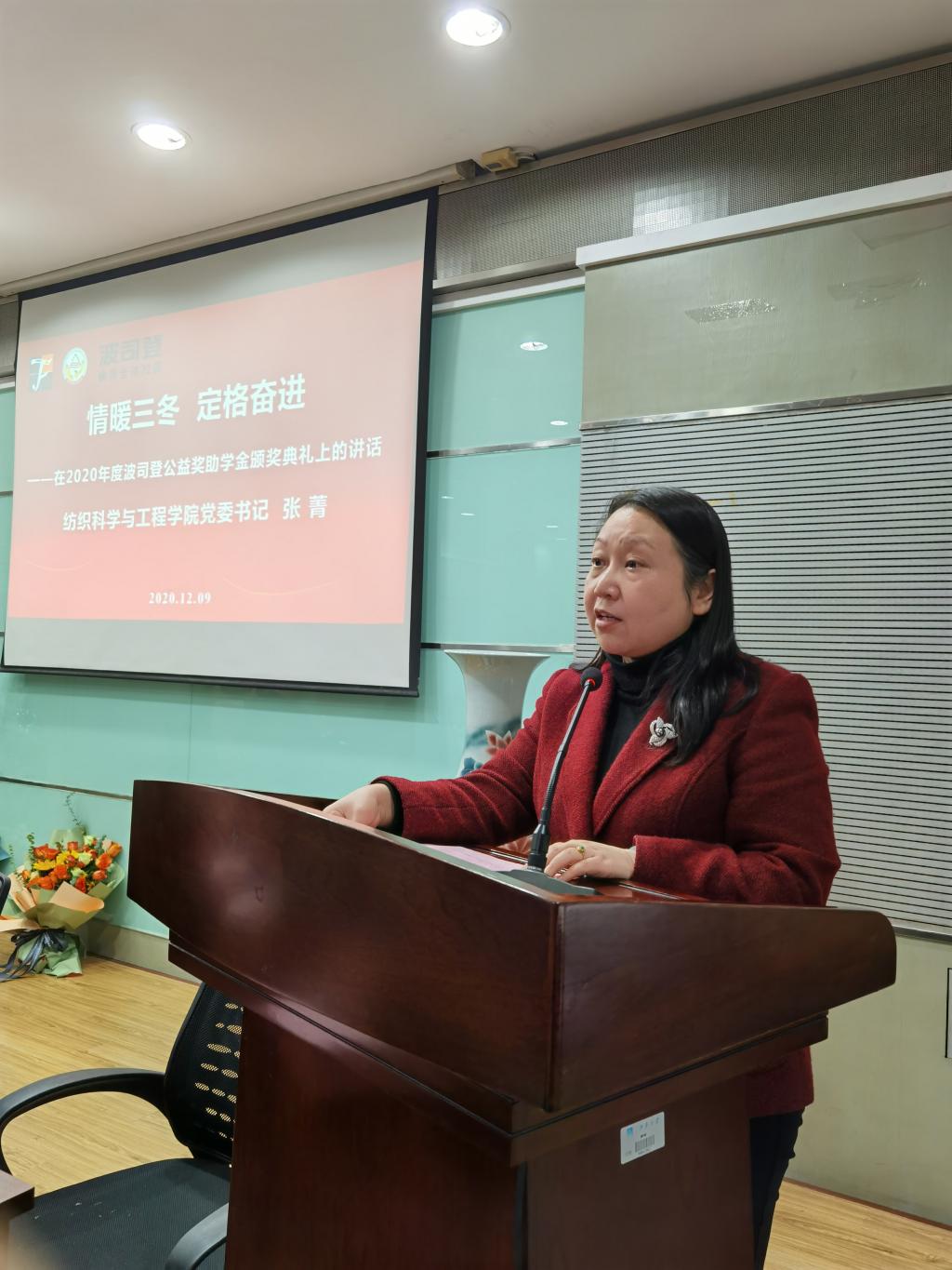 典礼最后,张菁发表了热情洋溢的讲话。她首先代表学院对波司登集团长期以来关心支持江南大学教育事业的发展和纺织服装行业人才的培养表示衷心的感谢,对在座的嘉宾以及波司登集团领导的到来表示热烈的欢迎,对受到奖励资助的82名同学表示由衷的祝贺。她希望在座的各位受奖励资助的同学在今后的学习生活道路上懂得感恩,珍惜当下,学好专业知识,掌握过硬的本领,不断提高实践创新能力,成为未来纺织服装行业内的中坚力量和行业头雁。