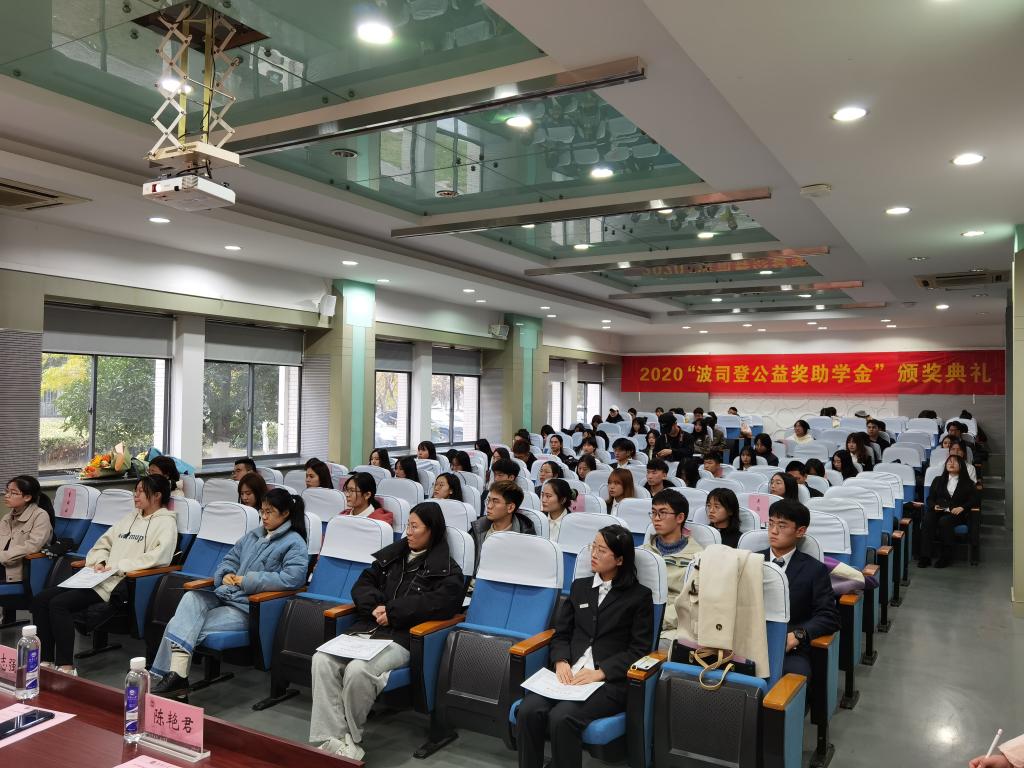 陈艳君首先宣读颁奖决定。根据相关文件规定,经学生本人申请、学院初评、评审委员会审核的工作程序,评选出纺织科学与工程学院黄婕妤等56名同学、设计学院服装专业李莉等26名同学获得2020年度“波司登公益奖助学金”。
