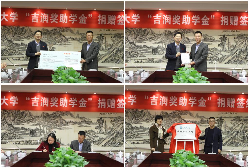 接着,在双方领导嘉宾的见证下,张菁与范恒明签署了捐赠协议,张菁燕与范毅峰为就业实习基地揭牌。张凌浩代表学校和学院接受了捐赠,并向吉润公司颁发捐赠赠书。