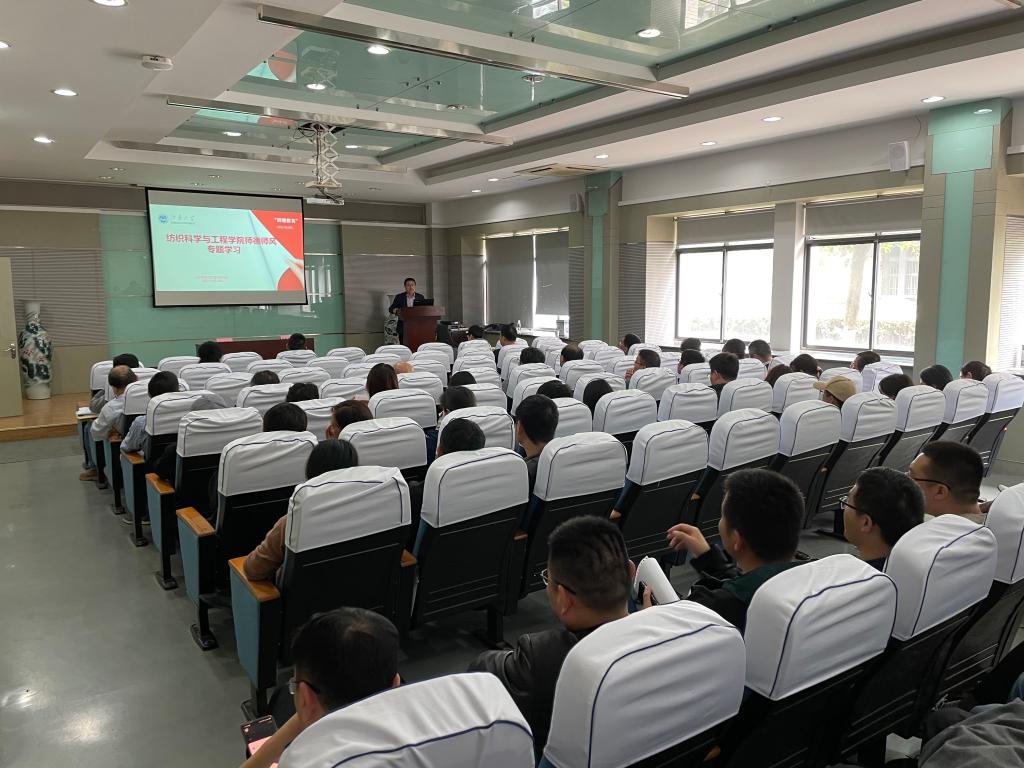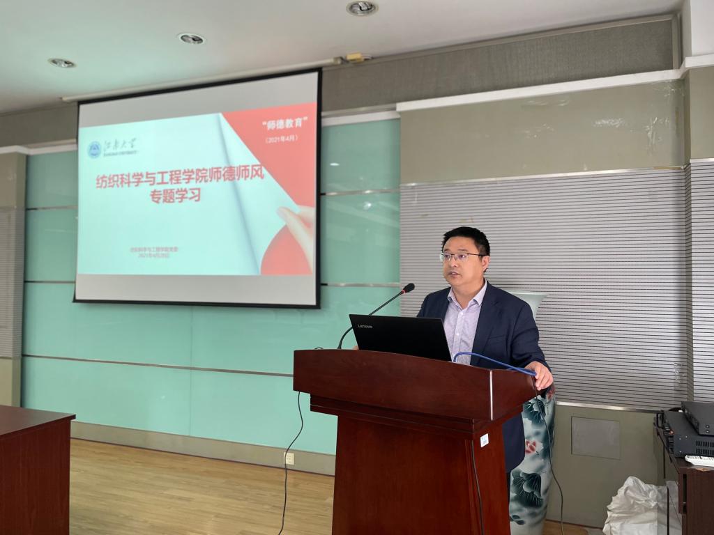 4月28日,纺织科学与工程学院在A103会议室召开全体教职工大会,进行师德师风警示教育专题学习,会议由党委书记张菁主持。
