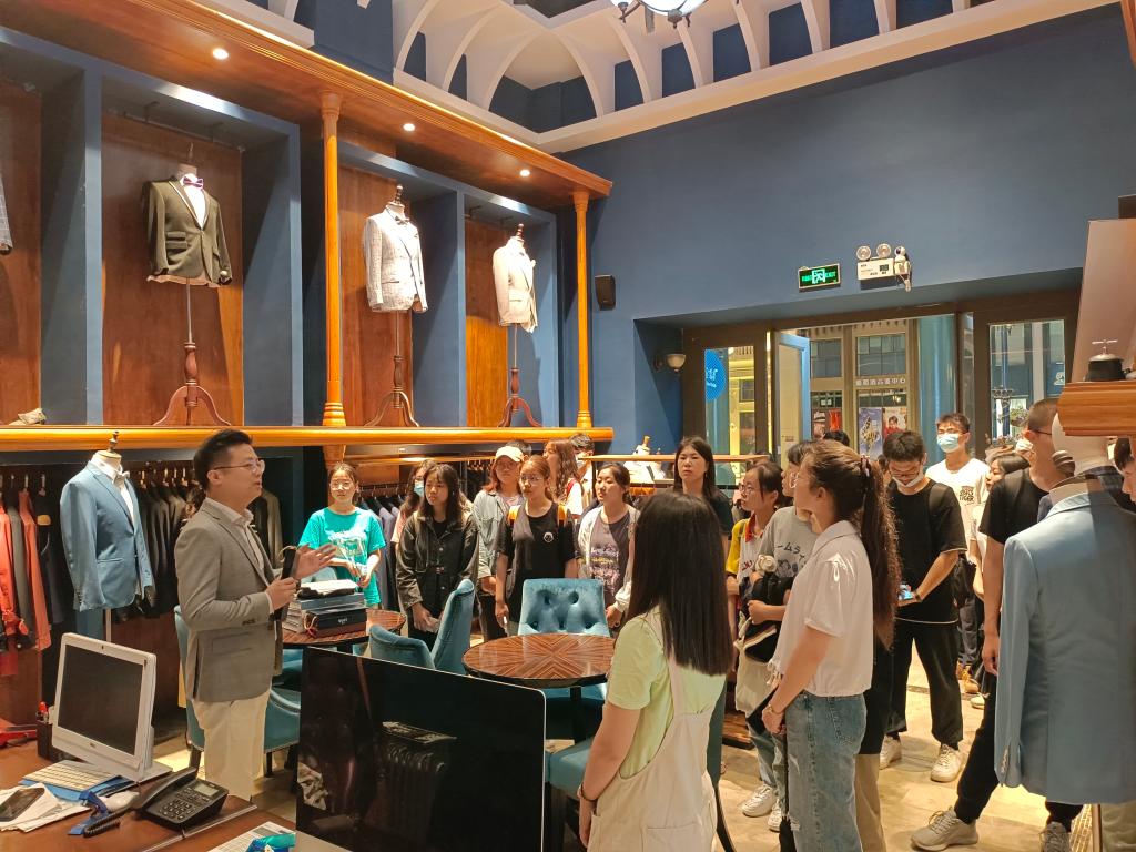 接下来,师生来到科技园区内的学生创业企业参观。在b站百万粉丝up主神奇的老皮VFX的工作室,同学们了解到视频博主的幕后团队工作,并对团队高超的特效技术和极具创新性的策划赞叹不已。在无锡市远方文化传媒科技有限公司,同学们聆听了公司负责人的创业经验谈,纷纷表示要在保证学业成绩的同时不断提升自己的创新能力,多体验、多挑战。最后,一行人来到位处华莱坞影都的麦梯定制店铺参观,这是原江南大学纺织服装学院的校友马腾创办的麦梯时尚创意设计有限公司。公司以西装定制为主营业务,曾获江苏省创业明星单位、江苏省优秀民营科技企业、江苏省青年创业见习基地等荣誉称号。马腾深情回忆了在学校度过的美好时光,认真为同学们讲解了西服定制的专业相关知识,分析了纺织行业的现状,鼓励大家敢于创新,敢于拼搏,期待同学们运用专业知识在纺织服装行业创造自己的价值。