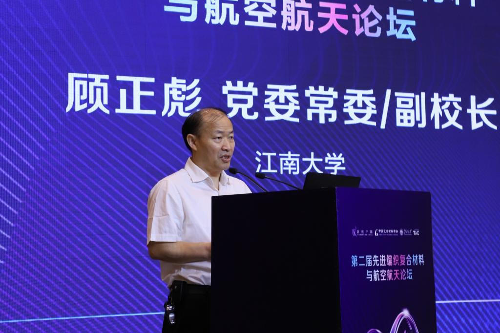 顾正彪代表江南大学致辞,他介绍了学校及纺织学科的发展情况,并对本次会议主办单位及协办单位表示了衷心的感谢。他表示,本次论坛的举办将深入研讨先进编织复合材料产业学科与发展动态前沿趋势,充分展示先进编织复合材料技术应用,有助于推动长三角航空航天用先进编织复合材料产业发展。