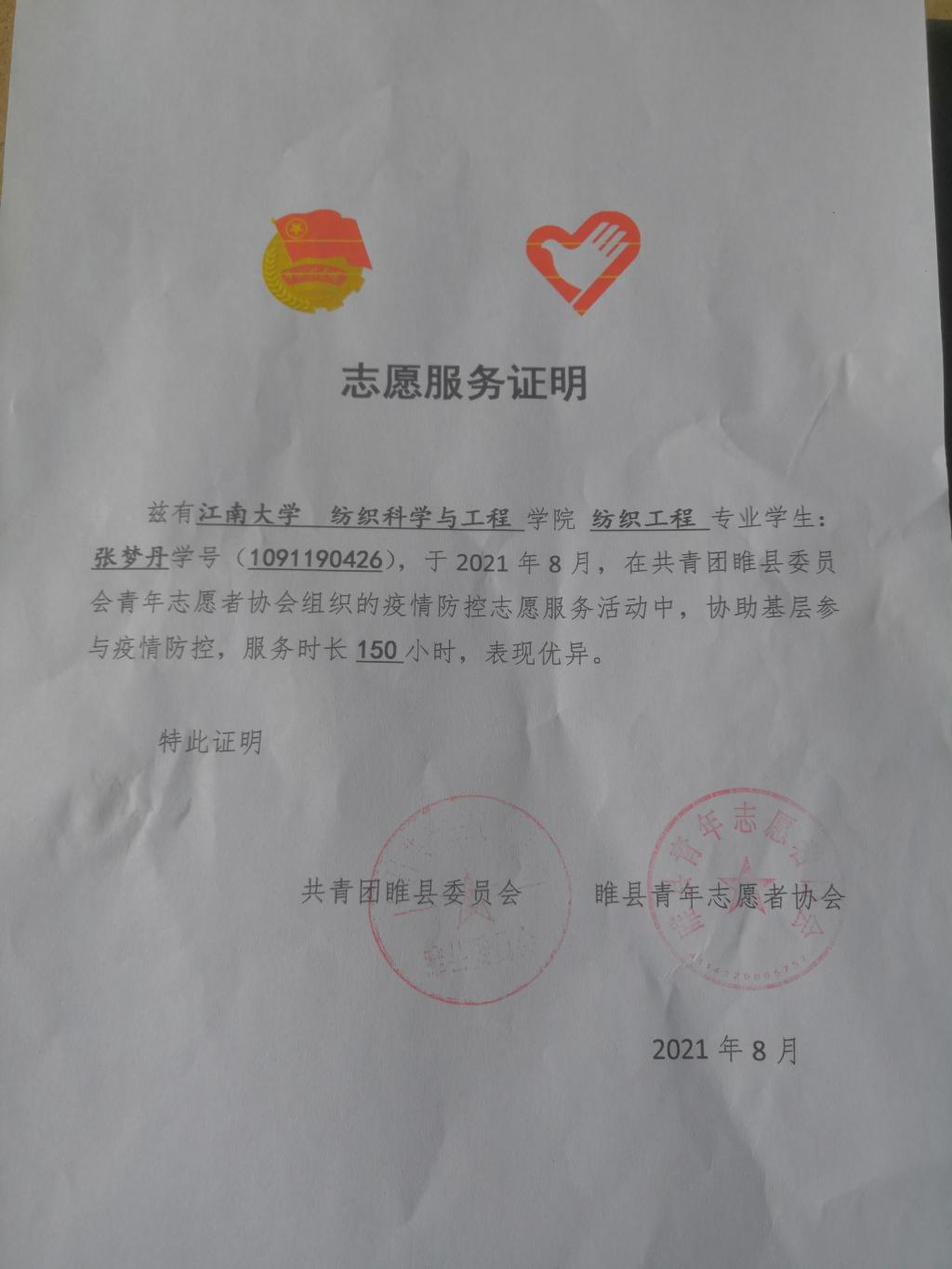 张梦丹同学志愿服务证明