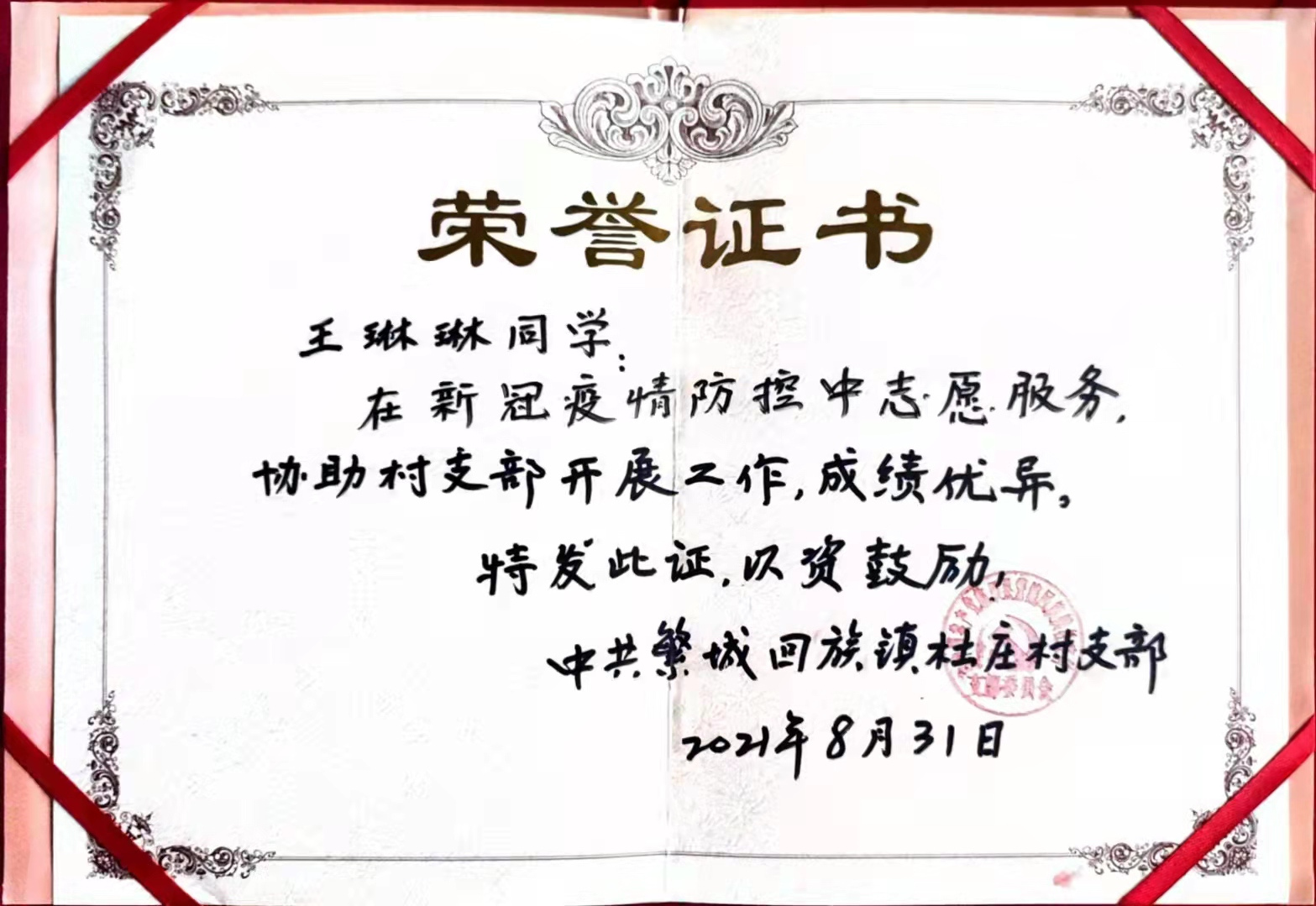 王琳琳同学表彰函