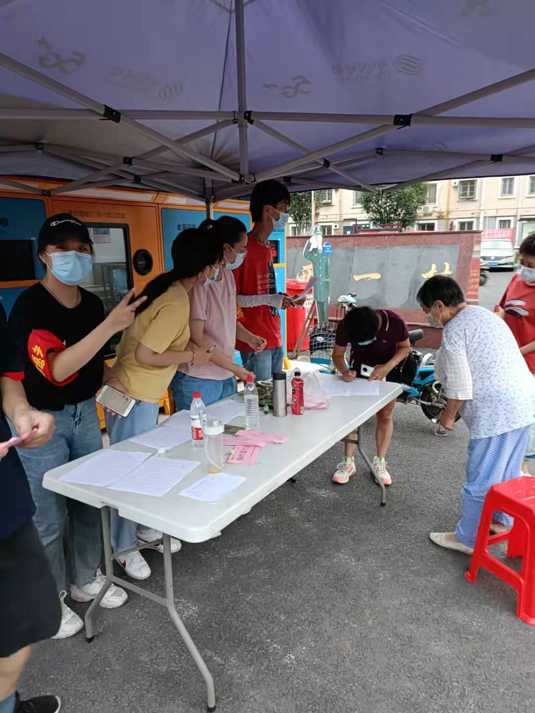 现在,扬州全域已经降为低风险地区,各项生活常规工作正常开展,每每回想起当时的疫情防控工作,她总是感慨良多。盛夏酷暑,她告别了凉爽舒适的空调房,与其他志愿者们一起坚守在小区门口,仔细认真地查询每一位进出居民的健康码和行程码、测量体温。虽然每天都会无数次重复“您好,麻烦出示一下两码,请配合测量一下体温。”有时候声音已经嘶哑,但是为了社区居民的出行安全,她仍然在工作岗位认真工作,到了七小时换班的时候,往往已经汗流浃背。8月3日首轮核酸检测,陈欣悦同学在社区的组织分配下负责维持现场秩序。她犹记那天天气阴晴不定,前来做核酸的居民很多,现场秩序比较混乱。她和其余几个志愿者立马开始疏散群众,帮助他们按照一米线站好,并且耐心地安抚他们的情绪。她回忆道:“当时做核酸需要进行注册,现场有一些叔叔阿姨不太会操作,于是我们一边维持着现场秩序,对后面等待的居民进行回复,一边帮助有需要的人进行注册。”从下午三点一直连轴转到凌晨一点,她只来得及匆匆忙忙地吃个晚饭,转头就又投入到维持现场秩序的工作当中。工作结束后,她的脸上被口罩勒出了印子,手也被手套泡得发白,但是看到全民检测工作顺利结束,她的内心也充满了喜悦。她说:“虽然很辛苦很累,但是最后结果很好,吃这点小苦也不算什么,真正辛苦的是一线的工作人员,我更需要向他们学习!”第二轮核酸结束之后,她又马不停蹄地配合社区人员进行入户走访调查。带着面罩口罩的她,挨家挨户地了解疫苗接种情况、核酸检测情况,秉持着“不漏一户,不落一人”的原则,做了完善详备的记录。楼道闷热,她的衣服湿了又干,干了又湿,面罩和口罩里都浸满了汗水,滴在记录纸上。即便如此,她也全力配合工作人员以最快的速度完成了调查。“青春正当时,我想用自己的青春活力,为疫情防控的胜利添上一块稳稳的砝码!”