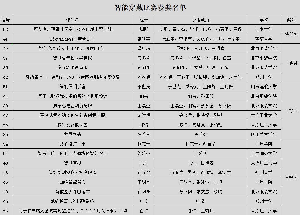 智能穿戴组获奖名单截图