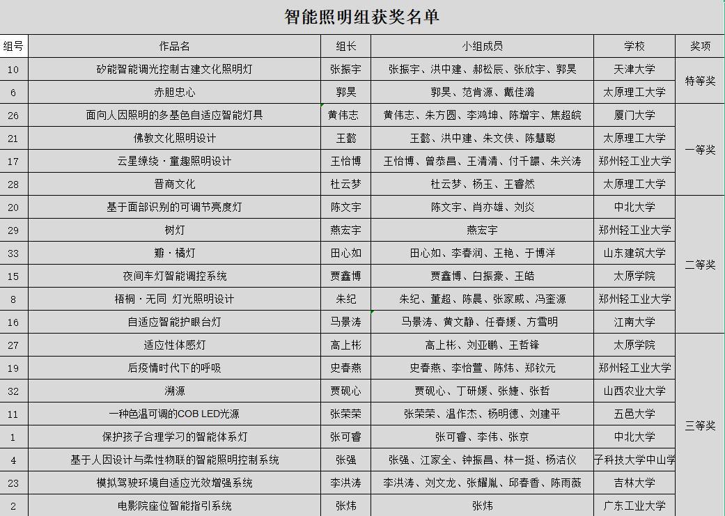 智能照明组获奖名单截图