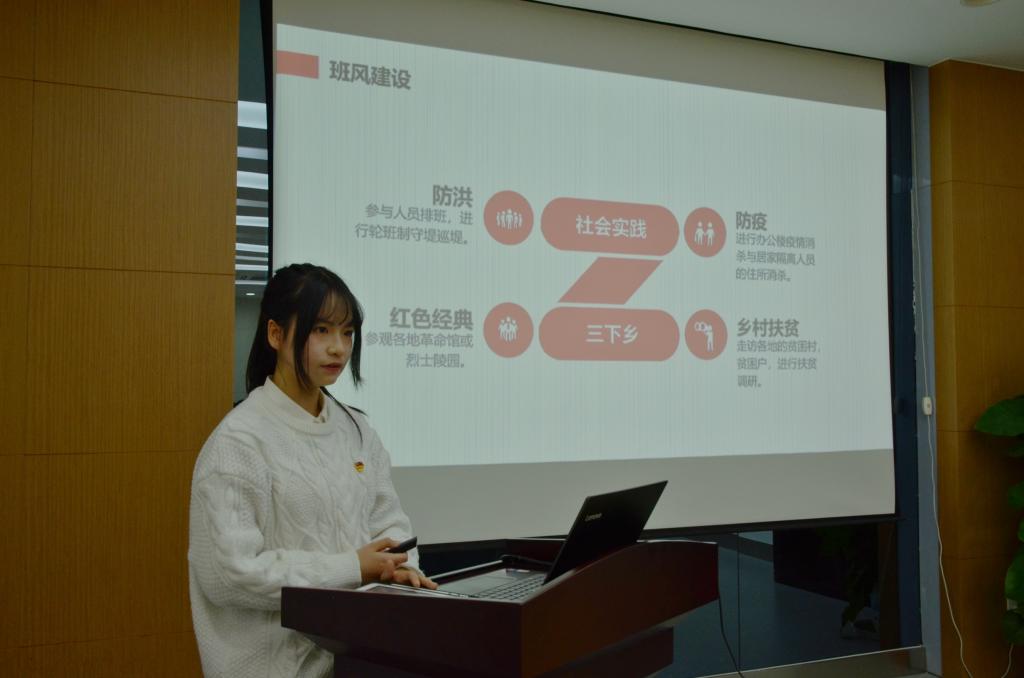 首先,胡紫瑞介绍了本次主题团日活动开展的背景情况,团支部把握契机,开展系列主题教育;榜样选树,弘扬向上向善力量;从严治团,建设活力团学骨干。随后团支部书记黄子宁从学风引领、班团建设、志愿服务三个方面进行了精彩的支部风采展示,班级优秀学生代表张鑫瑶分享个人学习方面的经验。整个展示环节从四个方面展示了纺织2006班进入江南大学446天中发生的故事,向与会领导老师展现出纺织2006班团结友爱、勇往直前的精神风貌和江南纺织学子青春洋溢、斗志昂扬的创新活力。顾正彪就班级团支部一年多来取得的成绩点赞认可,对班级未来的发展建设给予深切厚望。