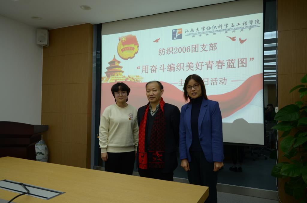 12月8日下午,校党委常委、副校长顾正彪参加纺织科学与工程学院纺织2006班团支部“用奋斗编织美好青春蓝图”主题团日活动。纺织科学与工程学院党委书记张菁,校团委副书记杨飏,学院党委副书记、副院长陈艳君,纺织2006班班主任丛洪莲,学院分团委书记陈裕,纺织工程2006班团支部全体成员参加本次活动。活动由纺织2006班班长、团支部副书记胡紫瑞主持。