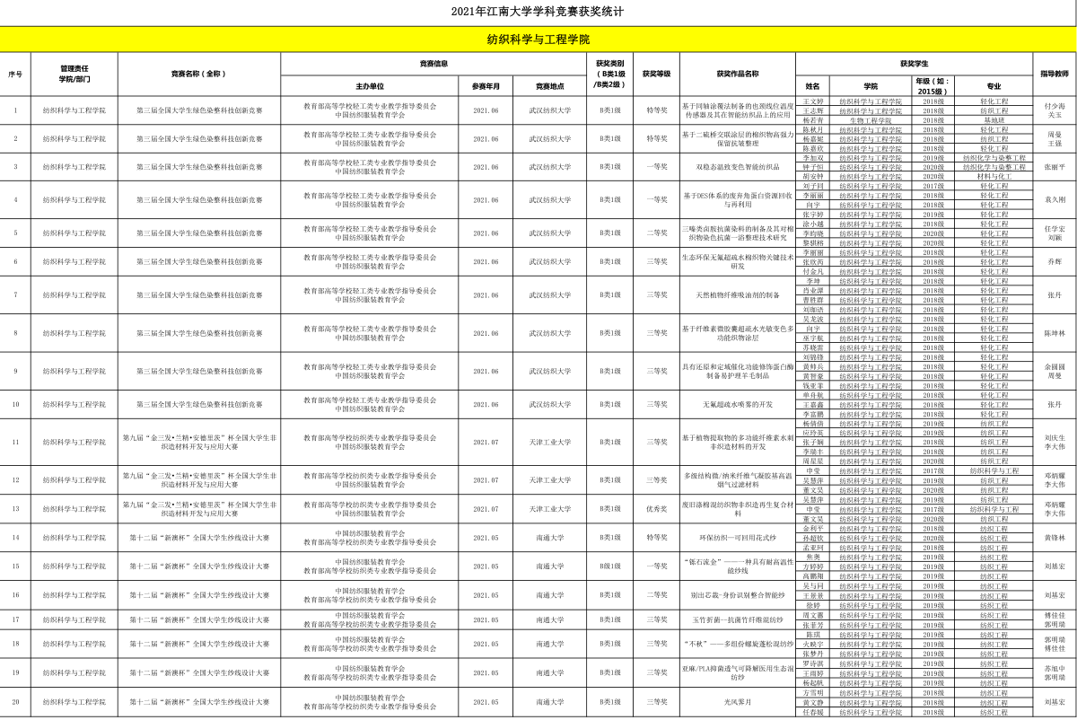 全国大学生纱线设计大赛、全国大学生绿色染整科技创新竞赛、全国大学生非织造材料开发与应用大赛均为《江南大学大学生学科竞赛目录(2021年)》B1类赛事。三项赛事由教育部高等学校纺织/轻工类专业教学指导委员会、中国纺织服装教育学会主办,是全国纺织类高校学生的专业学科赛事,在江南大学大学生学科竞赛管理体制中,归口纺织科学与工程学院负责。