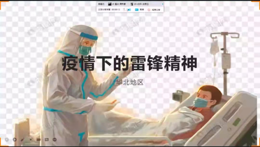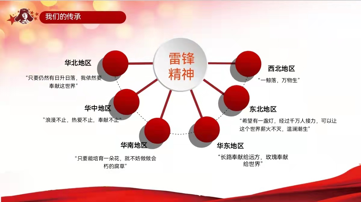 华北地区——“只要仍然有日升日落,我依然要奉献这世界”。华北地区的团员青年们报名成为了志愿者,在医院里与许多同龄人甚至弟弟妹妹一起维护秩序,一起打扫卫生等等,他们表示这就是雷锋精神以及雷锋精神的传承。华中地区——“浪漫不止,热爱不止,奉献不止”。华中地区的团员青年们参加了社区图书馆志愿者工作,他们表示作为大学生志愿者,应该弘扬雷锋精神,为社会献上一份绵薄之力,志愿服务应该贯穿于日常生活的点滴细微之处。华南地区——“只要能培育一朵花,就不妨做会朽的腐草”。华南地区的团员青年们开展了学雷锋纪念日的相关活动,他们表示生活在一个相对和平的国度,虽未能效仿烈士为祖国做出伟大牺牲,但也能学习雷锋同志,做好日常生活中的一点一滴。华东地区——“长路奉献给远方,玫瑰奉献给世界”。华东地区的团员青年们举行了一次“寻找身边的榜样”活动,活动是以“身边的好人好事”优秀征文展和“走入生活,参与生活”社会实践小报展这两种形式举行。东北地区——“希望有一盏灯,经过千万人接力,可以让这个世界薪火不灭,温澜潮生”。东北地区的团员青年们在空余时间帮助东北地区的环卫工人们清理道路上的积雪,更能体会到环卫工人门的辛苦。不仅这样我们小组有的组员还在疫区积极参加了志愿者活动,帮助防疫工作者做一些像登记、维持秩序、消杀等力所能及的工作。西北地区——“一鲸落,万物生”。西北地区的团员青年们利用空余时间参加了社区志愿活动,在春节假期前后,先后组织了看望独居老人、保护街道环境、遵守交通法规等多个活动,学习雷锋精神,让雷锋精神在全社会蔚然成风,争做雷锋精神的种子。