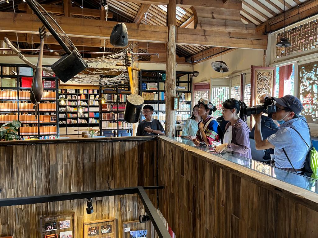 支教团利用周末时间深入寻访丽江古城,调研非物质文化遗产——纳西古乐的传承情况。通过访谈古乐传承者,支教团了解到纳西古乐面临的失传困境。为了保护、传承纳西古乐,传承者们选择新颖方式宣传纳西古乐以吸引年轻群体,自2021年12月建立以来,宣科书房举办了20余场精品文化项目,项目包括读书会、手工沙龙、纳西古乐欣赏等等活动。借力文旅结合,传承者们既顺应了时代的发展,又坚守住了传承古乐的本心,将纳西古乐这一优秀的民族文化瑰宝流传下去。