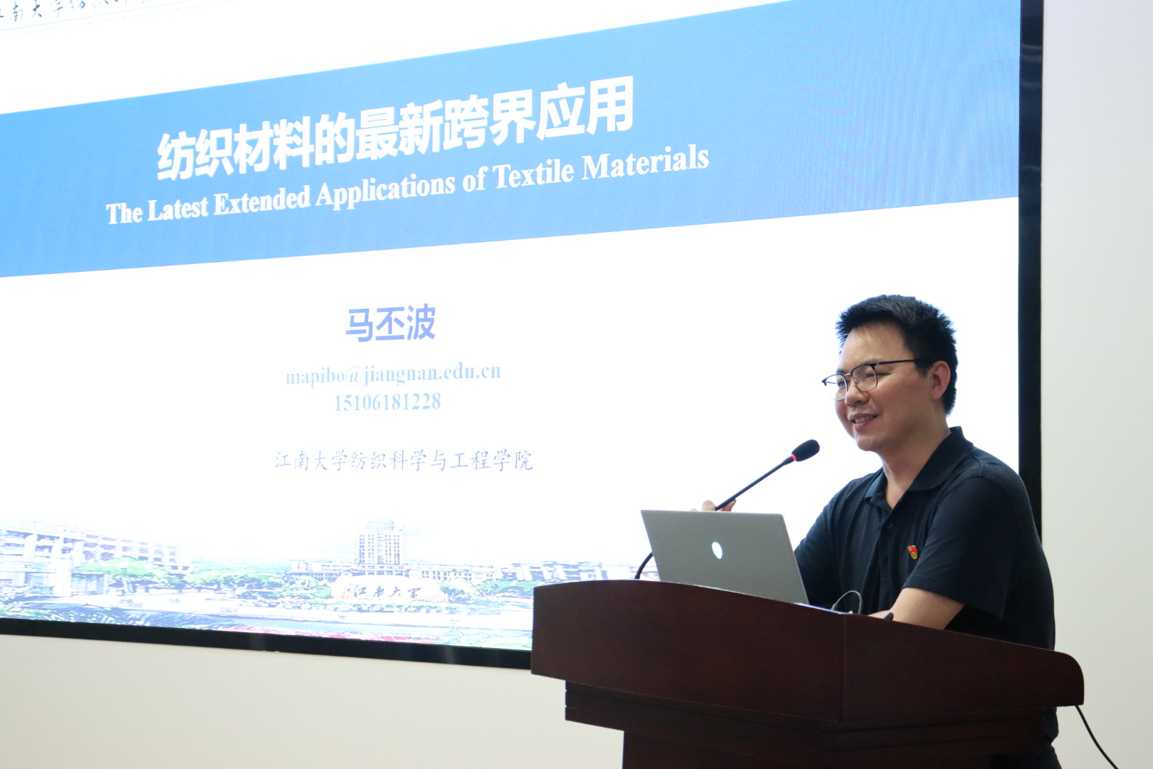马丕波以“纺织材料的最新跨界应用”为主题作专业要闻。马丕波结合个人求学经历,生动诙谐地向同学们介绍了纺织工程和轻化工程专业、中国纺织工业的现状以及学院在研的各类纺织结构织物。他指出,纺织行业已不是传统的纺纱织布,而是在与多学科交叉融合的过程中,朝着“面向世界科技前沿、面向经济主战场、面向国家重大需求、面向人民生命健康”的方向发展。除此之外,他还向学生们介绍了几个学生培养案例,激励着同学们向更高更远的方向奋进,纺织未来有无限可能。