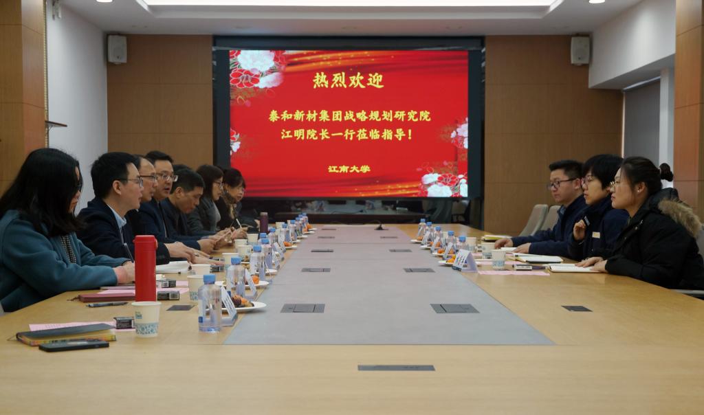 1月30日,泰和新材集团股份有限公司战略规划研究院院长江明、副院长关振虹,携相关部门负责人一行莅临江南大学纺织科学与工程学院交流。学院院长付少海、产业技术研究院副院长谢卫忠、学院副院长马丕波、针织技术教育部工程研究中心主任蒋高明、副主任丛洪莲,以及十余名教授出席会议。会议由马丕波主持。