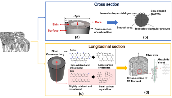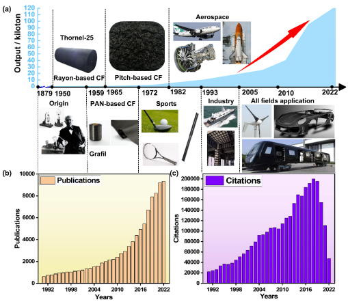 近年来,在低碳、节能、减排的大背景下,碳纤维增强聚合物(CFRP)复合材料以其在诸多领域的广泛应用和优异性能备受关注。然而,一些固有缺陷严重威胁碳纤维(CF)结构件的服役安全。研究表明固有缺陷主要有:(1)CF表面非极性、化学惰性,导致复合材料界面性能差;(2)CF脆性大、易磨损,断裂韧性低,弯曲半径小,导致纤维在制备过程中易断裂以及产生大量毛丝。因此,为了满足高性能CFRP复合材料的巨大需求,推动工业化发展水平,有必要对CF进行表面改性提高复合材料强度和韧性。尽管近几十年来在CFRP复合材料的力学增强方面取得了很大的进展,但仍然缺乏涵盖其解决方案的最新综述。