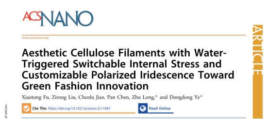 这种性能优异的美学纤维在生活用品、时尚场景、光学织物防伪以及信息存储等领域具有广阔的应用潜力。同时,这种制备方法还可实现规模化、连续化生产,因此在产业化生产及应用中表现出极大的潜力。该研究以题为“Aesthetic Cellulose Filaments with Water-Triggered Switchable Internal Stress and Customizable Polarized Iridescence Towards Green Fashion Innovation”的论文发表在国际顶刊《ACS Nano》上,博士生傅晓童作为第一作者,龙柱教授作为通讯作者。