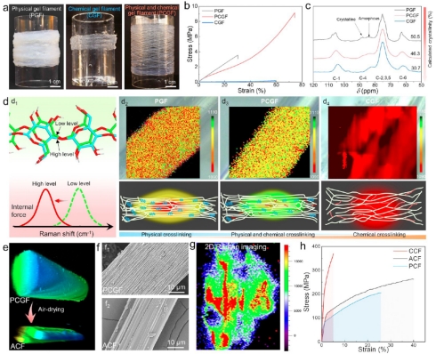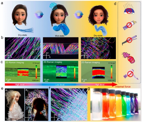 近期,江南大学纺织科学与工程学院龙柱教授团队联合安徽农业大学叶冬冬团队,创造性地开发了美学纤维素纤维(ACF)的制备方法,破解了上述难题。所制备的ACFs在交叉偏振光下呈现斑斓的彩虹色,还表现出极强的韧性,即使单根纤维也可承受100克的重量,并且经过反复缠绕和解缠,纤维表面的有序纳米结构并未被破坏。更有趣的是,作者通过拉曼成像证实,简单的水触发即可调控ACF的内应力,从而实现纤维三维形态的自主定制:湿态下,纤维内应力极低,可以实现纤维的临时造型;而随着纤维逐渐干燥,纤维内应力开始变大,从而实现纤维复杂3D造型的记忆。