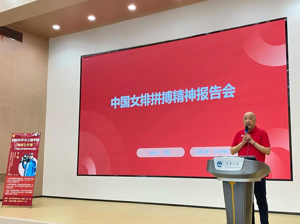 5月26日下午,纺织科学与工程学院于第一教学楼1C109开展“中国女排拼搏精神”信仰公开课,天津传媒学院特聘教授、著名播音指导王喆受邀担任主讲嘉宾,学院学工办主任兼分团委书记陈裕、轻化工程系老师顾鹏,以及江南大学百余名学生参加活动。此次活动是学院第十届“青年马克思主义者”培养工程培训环节之一。