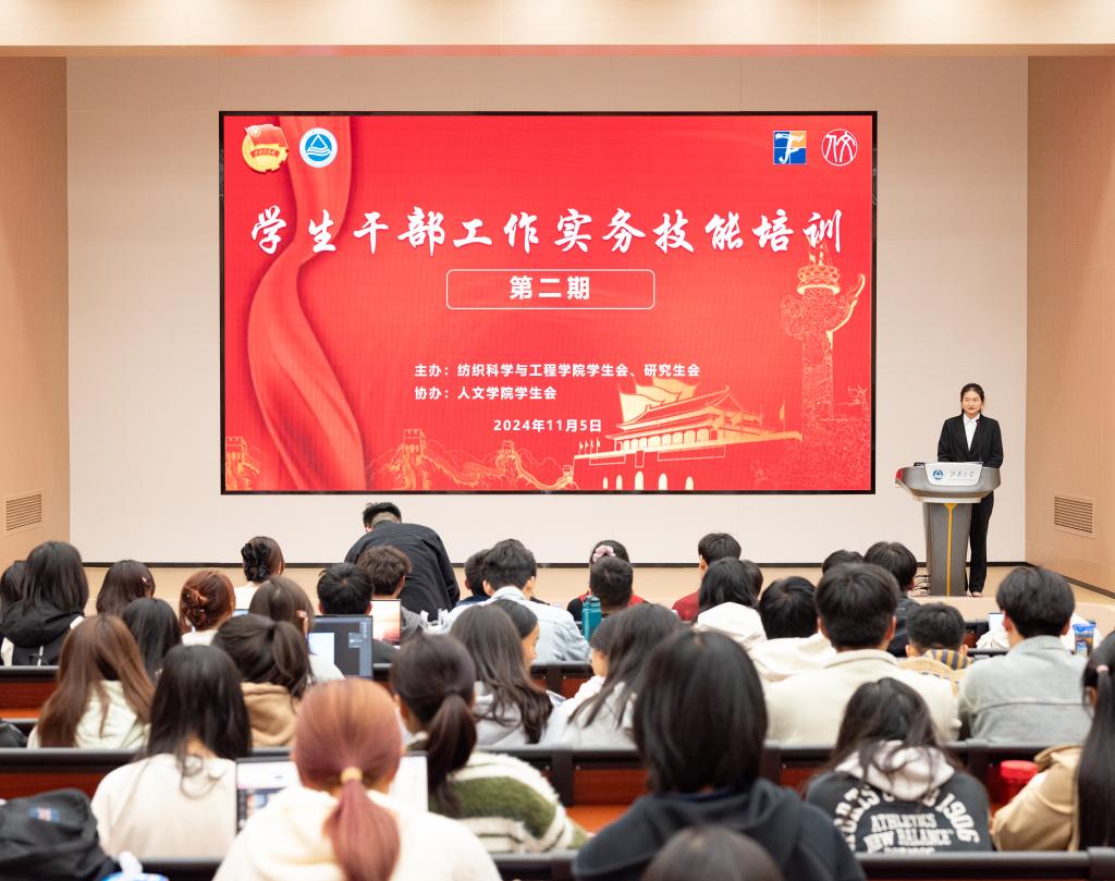 近日,纺织科学与工程学院第二期学生干部工作实务技能培训在第一教学楼1C109顺利举办。本次培训由纺织科学与工程学院学生会、研究生会主办,人文学院学生会协办,两院学生组织成员、2024级班团骨干等300余名学生干部参与了本次培训,培训由学生会办公室周子文主持。