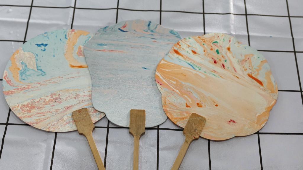 同学们充分发挥自身的想象力,将选好的色彩滴入水中,水因势而走,色彩穿插交错,一沉一提之间,漆料在扇子上翩翩起舞,提出水的扇面瞬间印上色彩绚丽的图案,一幅幅诗情画意的漆扇呈现在眼前,展现出制作者不同的个性与艺术才华。