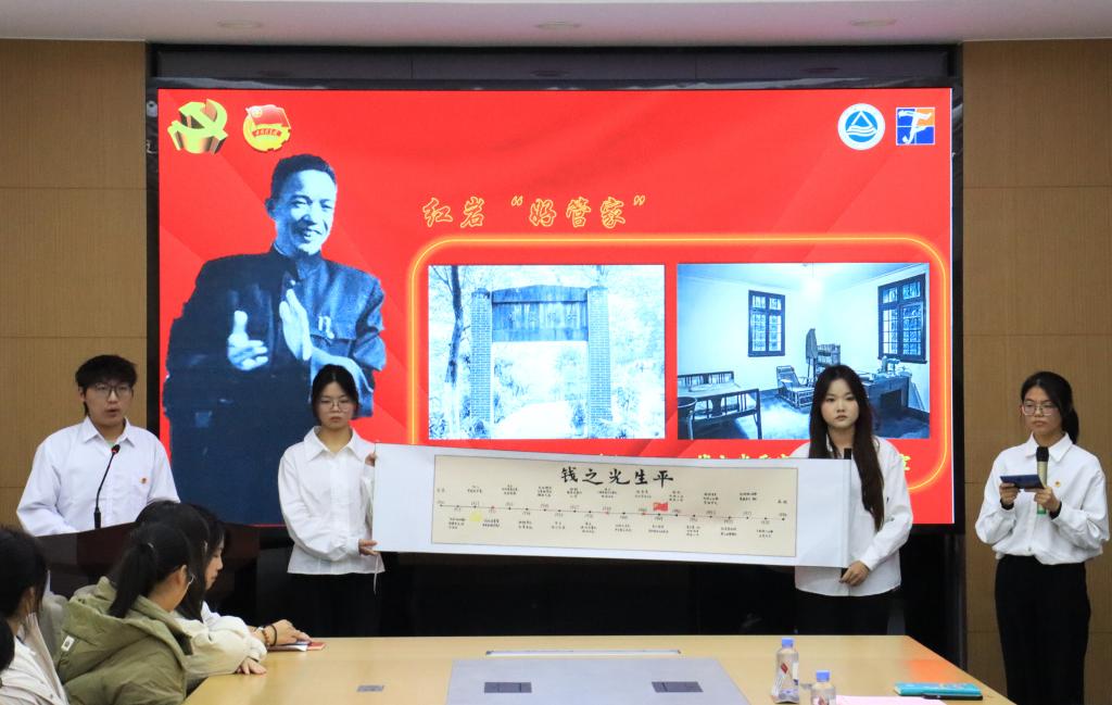 活动中,团员们通过“知光”引领、“织光”成炬、“至光”前行三个部分学习怀念钱之光先生为纺织行业做出的杰出贡献。通过卷轴展示、情景讲述,以“知光”引领探寻钱之光波澜壮阔的一生。透过历届“纺织之光”获奖学子的感谢信,展示他们在新的学习、工作岗位上“织光”成炬,不断追求卓越的奋进脚步。随后,纺织2202班团支部书记李子心以《争做向光的五色青年——追逐光、成为光、发散光》为题,分享求学中“至光”前行故事。会上,吴垚为王鸿博颁发“钱之光”特称团支部指导教师聘书。