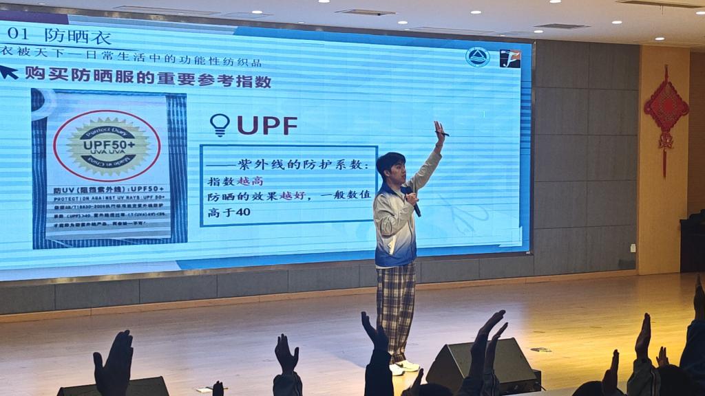 活动现场,主讲人王生域以其幽默风趣、深入浅出的讲解方式,引领学生深入了解纺织品在日常生活与专业领域的广泛应用。从防晒衣、速干衣等日常用品,到飞机、深海探索器“蛟龙号”,再到宇航服等高科技产品……王生域逐一揭示这些高科技纺织品背后的“织”造奥秘,生动展现了纺织科技如何助力人民福祉与国家发展,点燃学生们心中的纺织强国之梦。