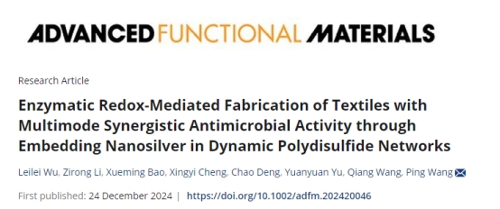 近日,江南大学纺织科学与工程学院生态染整研究室王平教授在材料领域国际顶级期刊《Advanced Functional Materials》发表题为“Enzymatic Redox-Mediated Fabrication of Textiles with Multimode Synergistic Antimicrobial Activity through Embedding Nanosilver in Dynamic Polydisulfide Networks”的研究论文,通过酶促氧化-还原构建包埋纳米银的聚二硫化物网络,制备了一种高效耐久性的抗菌抗粘附纺织品。