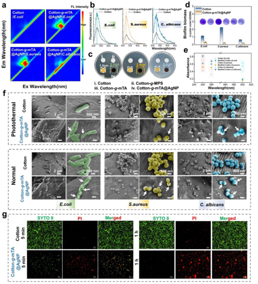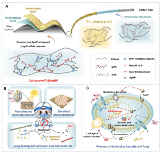 图3.AgNPs沉积织物多模式协同抗细菌和抗真菌的机制分析
