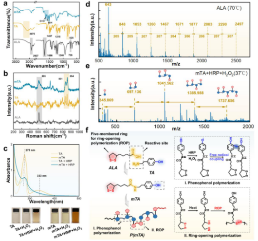 图2.含动态二硫键改性酪胺分子(mTA)的制备及酶催化氧化自聚合反应机理
