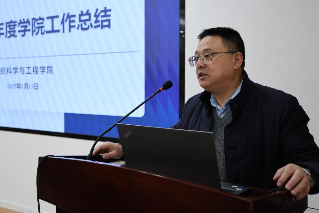 会议伊始,付少海首先作2024年度学院工作报告。他充分肯定了过去一年学院在国家自然科学基金、军工科研特色、科研获奖以及人才培养等诸多领域取得的显著成绩,并对学院完成的总体任务目标、标志性成果、教学与科研、各团队对标对表情况进行了深入透彻的分析。同时,他以学院前瞻发展的视角,提出了学院未来的策略规划与发展方向,强调在新时代、新形势发展的大潮中,学院必须坚持“四个面向”,精准定位学科方向,紧密围绕国家战略需求,不断拓展“纺织+”学科的新内涵,致力于打造具有鲜明特色、在国际上享有盛誉、国内一流的先进纺织学科。针对学院当前面临的问题与挑战,他明确提出了2025年的工作计划,号召学院全体师生接续奋斗,为学院建设的再攀登全力贡献智慧与力量。