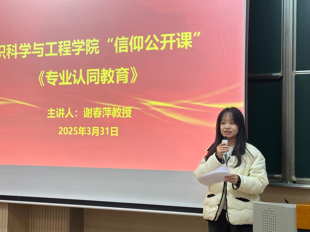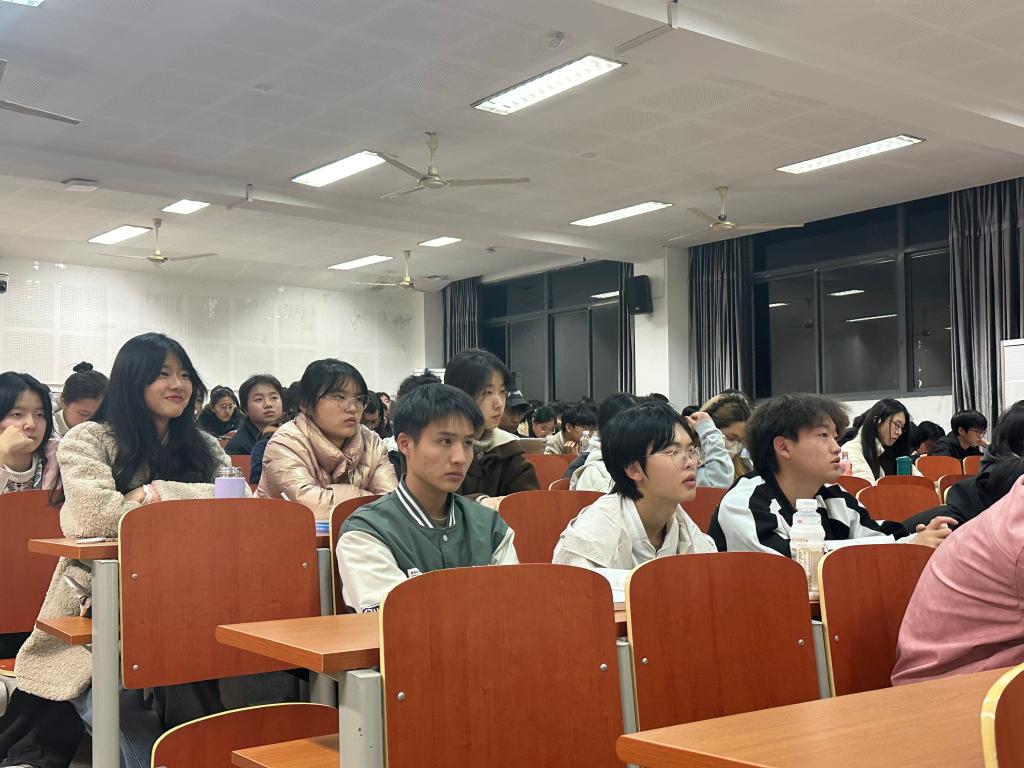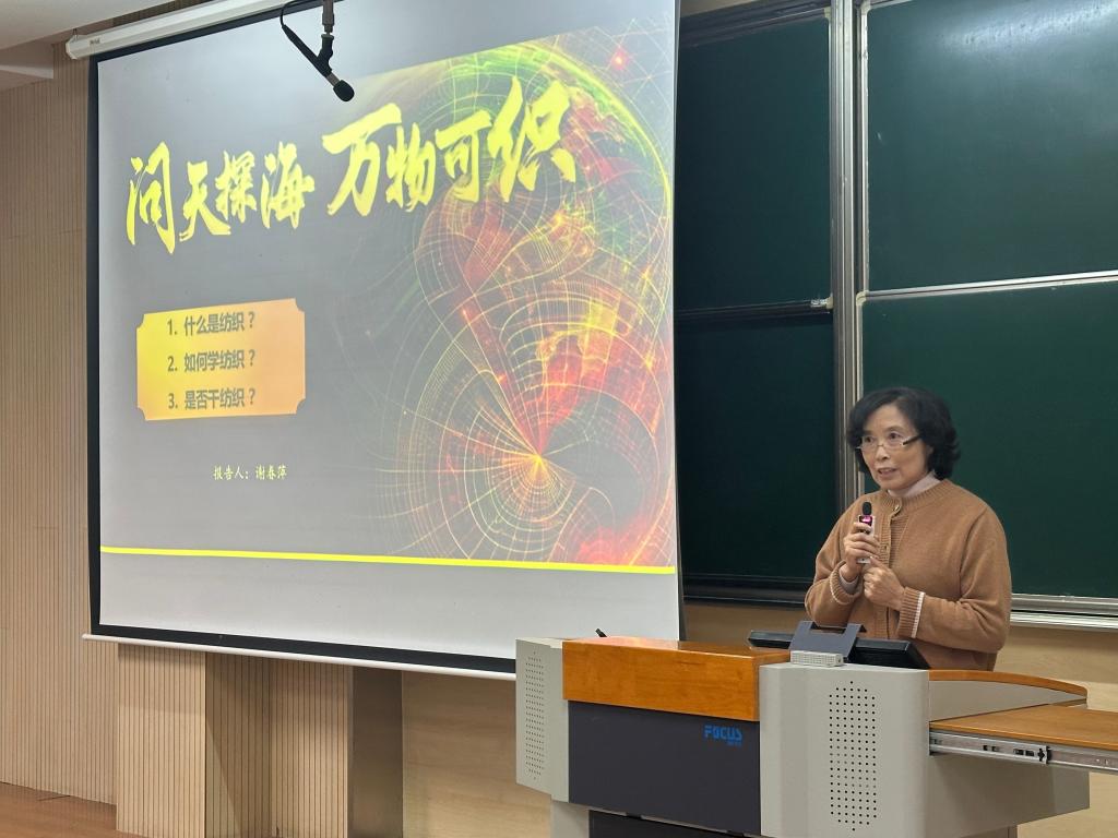 3月31日晚,纺织科学与工程学院在第一教学楼1B103举办“专业认同教育”信仰公开课。江南大学特邀报告员、学院关工委委员谢春萍教授担任主讲嘉宾,学院辅导员孙慧及2024级全体本科生参与本次活动。活动由团委通讯社李佳雯主持。