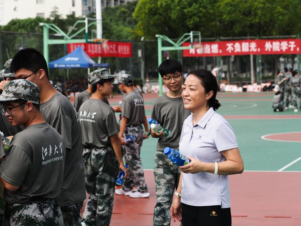 训练场上,同学们步伐铿锵、口号响亮,以整齐的队列和饱满的精神状态展示了多天以来的训练成果。学院老师们为同学们送上了解暑饮料和补给物品。一箱箱清凉、一句句问候,凝聚着学院的暖心关怀,也拉近了师生之间的距离。同学们也用热烈的掌声向带训教官、领导老师们表达感谢,迷彩映衬笑颜,训练场上温情流动。