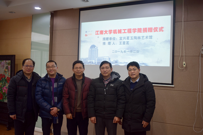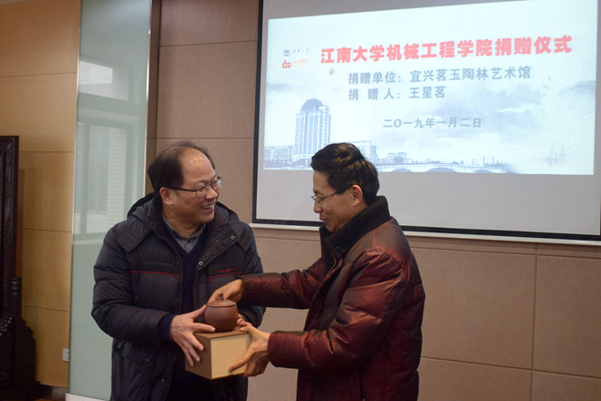 1月2日下午,机械工程学院“我爱江南”校友捐赠仪式在机械楼C310隆重举行。我校宜兴校友分会秘书长、宜兴茗玉陶林艺术馆总经理王星茗校友为机械工程学院捐赠26件“太湖神鼋紫砂壶杯”。机械工程学院党委书记黄正明,院长卢立新,院党委副书记、副院长方俊,党委秘书袁励红及学生代表出席捐赠仪式。仪式由方俊主持。