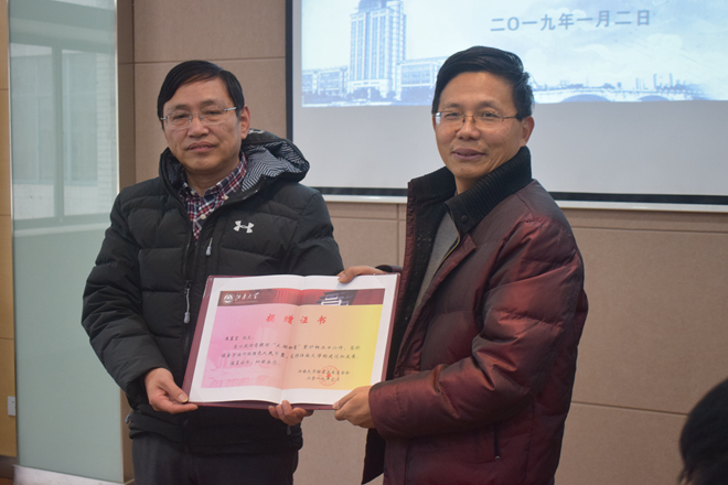 方俊向王星茗校友一行表示热烈的欢迎,在2019年新年到来之际,王星茗校友再次回到母校,为学院捐赠“太湖神鼋紫砂壶杯”26件,体现了作为一名校友的社会担当和责任。卢立新院长代表学院接受了此次捐赠,黄正明书记为王星茗颁发了捐赠证书。
