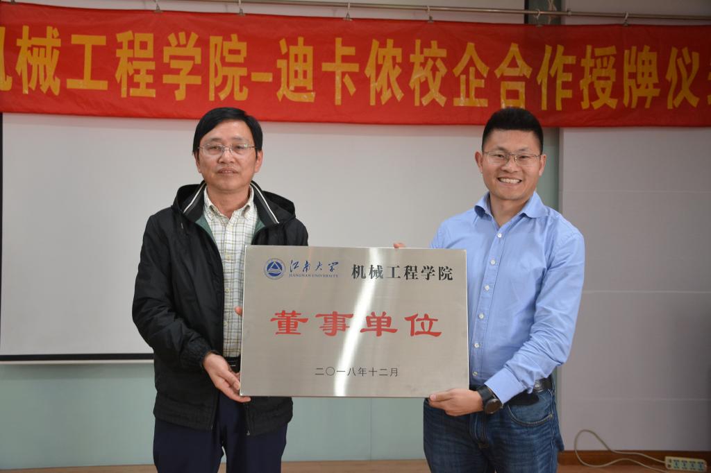 仪式开始,黄正明为迪卡侬授牌,方俊为迪卡侬颁发捐赠证书。迪卡侬苏州工业采购中心负责人赵世坤致辞,他向在场师生详细介绍了迪卡侬的企业文化,表示迪卡侬坚持以人为本,实行弹性工作制,公司氛围轻松且与机械专业契合度高,并鼓励、欢迎同学们毕业后到迪卡侬就职。方俊对迪卡侬公司为机械学院在人才培养,学科建设上的鼎力支持致以诚挚感谢,他期望同学们应该以积极的状态迎接即将到来的职业生涯,做一名有理想有抱负的有志青年。