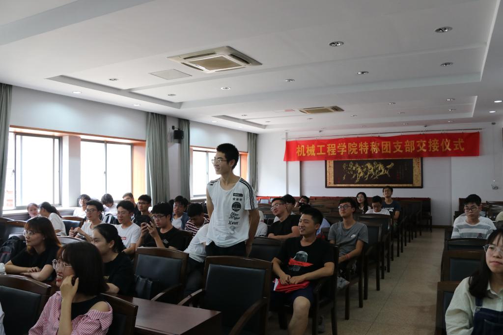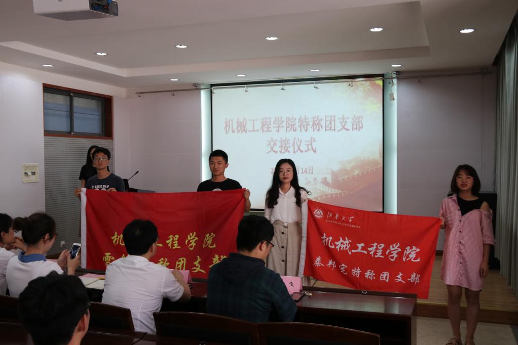 各团支部介绍完各自情况后,现场奏响共青团团歌,特称团支部旗帜交接仪式正式开始,包装1602将秦邦宪特称团支部旗帜交接至包装1701团支部,机电1602将雷锋特称团支部旗帜交接至机电1702团支部。