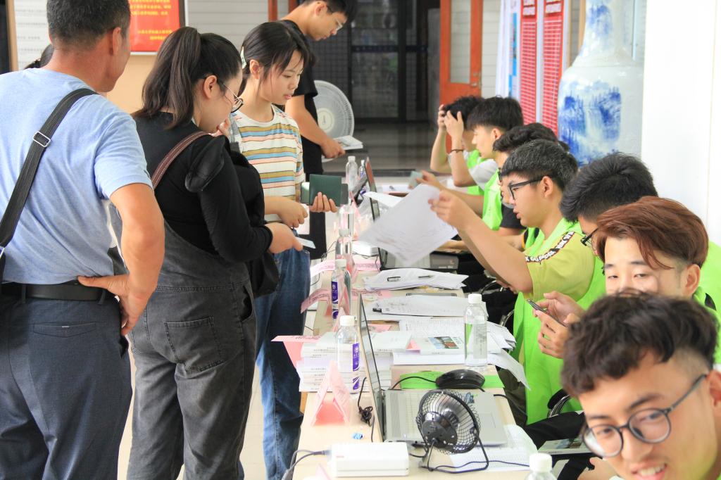 家长会召开前,28日上午7点起,机械工程学院早早地迎来了2019级406名本科新同学。院学生会成员和迎新志愿者有条不紊地进行布置场地、录入新生信息、发放体检表、协助办理贷款手续等工作。志愿者们还邀请新生在印有中华人民共和国成立70周年图案的迎新海报上签字,并拍照留念。