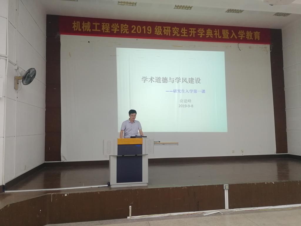 开学典礼结束后,俞建峰给大家上了研究生入学第一课“学术道德与学风建设”。俞建峰表示在研究生阶段大家既是学生也是科研工作者,要有科研人的道德素养,要有学术道德,要做到该做的事情用心做,不该做的事情绝对不做,同时也积极鼓励大家尽早参与导师项目,早日接触科研工作,充分发挥自己在团队中的作用。