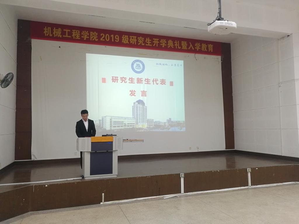 汪志强同学作为2019级研究生新生代表发言,他表示带着憧憬和期盼走入江南,承载了太多的努力与汗水,更承载了太多人的殷切希望。研究生生活是迷茫也是挑战,但全体新生会以低姿态、高效率“融智”,不断培育高尚道德情操,成为一名真正能推动社会进步的人。