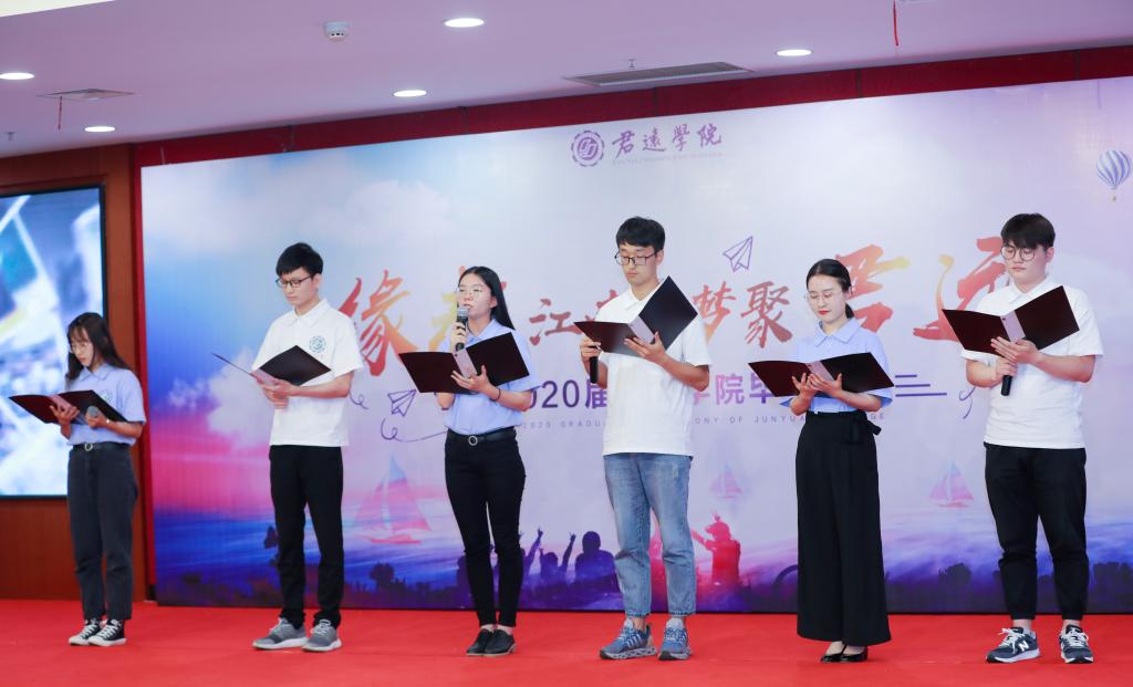 “天南海北,不期而遇;以梦为马,齐聚君远。”毕业生代表以一段配乐诗朗诵《梦聚君远,起航江南》抒发了他们浓浓的毕业情怀与对母校和学院的感恩与不舍,表达了他们定会珍惜奋斗每一天,朝着理想的彼岸乘风破浪,扬帆远航的决心。